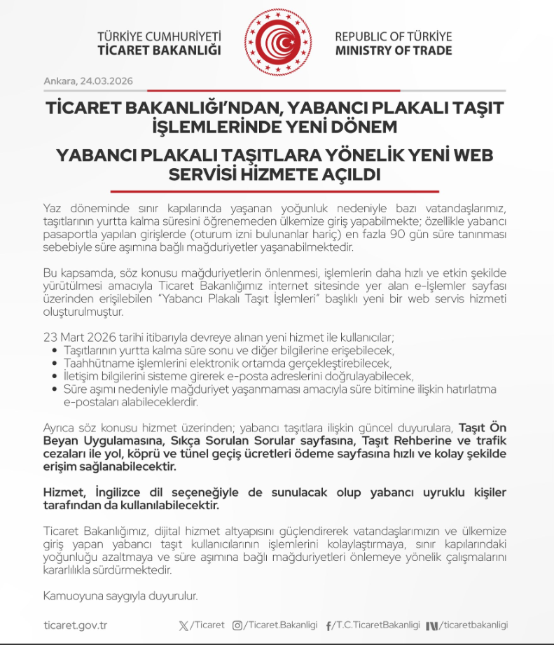 “Yabancı Plakalı Taşıtlara Yönelik Yeni Web Servisi” Ticaret Bakanlığımız tarafından hizmete açılmıştır.